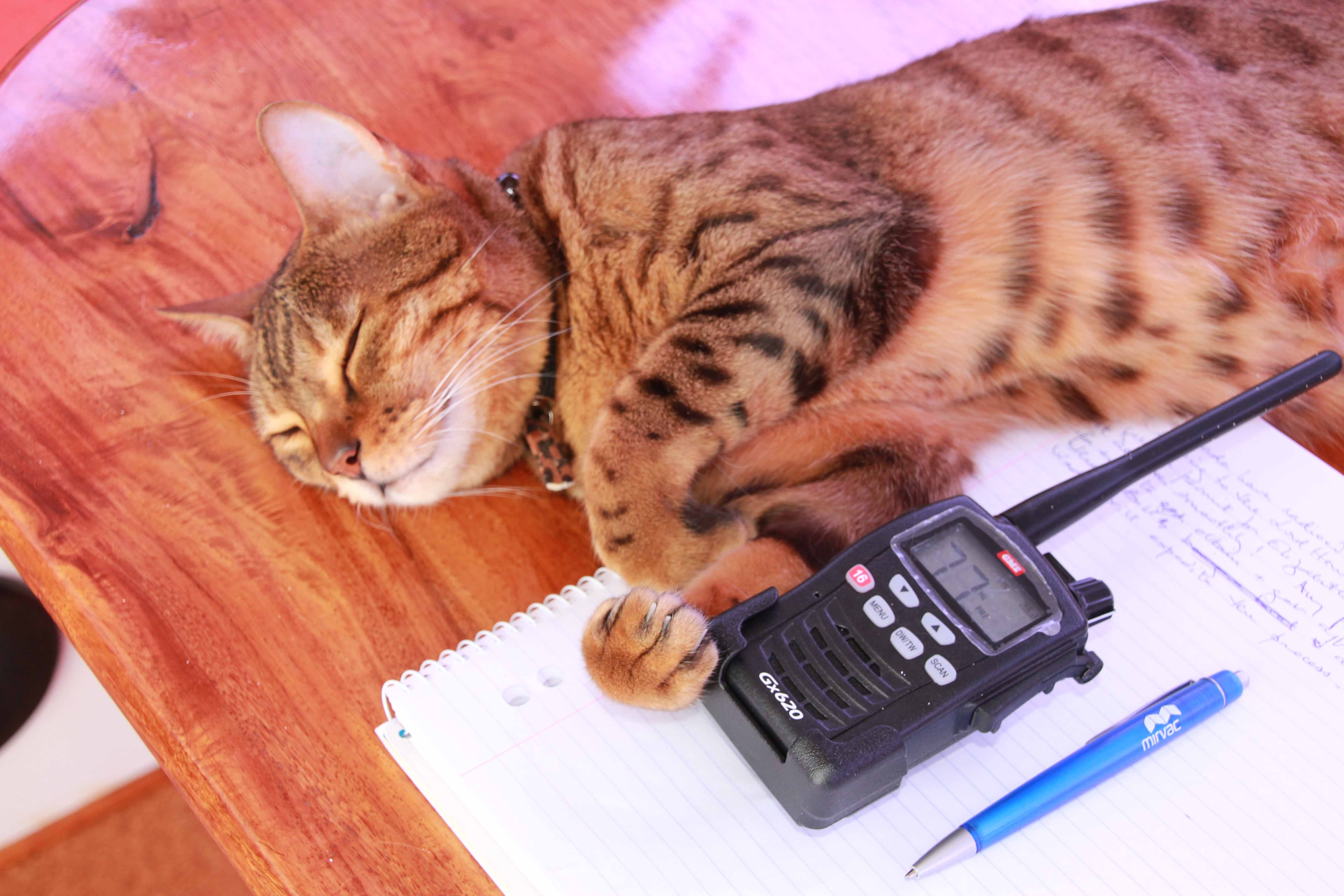 It has been a hectic few weeks beforehand, with last minute tasks such as affixing our new AMPAIR wind turbine to the back of the boat.  Stainless steel brackets had to be made to measure at the shipyard.  These were not ready until yesterday afternoon!  Wade and our friend Paul Dow, from the catamaran Skellum, were waiting in Paynesville for the brackets and pole to be finished.  By late afternoon the parts had at last been made.  Wade & Paul beavered away all evening.  By 1.00am the pole was assembled, the brackets fitted, the turbine mounted, wired  and working!  Nothing is ever easy on a boat, and it always, always takes two or three times longer than you expect to complete anything!  However, Ampy the windmill is up…  Phew!  We’ve done the fresh food shopping, packed our clothes, tidied up the house, ‘briefed’ Bengie  the shipcat who was looking a bit nervous, and we are ready to go.