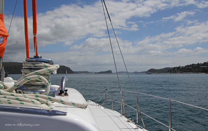 With Saturday being the last day of Southerly breeze till probably Boxing Day, we decided we would top up our water and fuel at Careel Bay Marina in Pittwater, then sail up to Swansea and Lake Macquarie, a good place to wait for the right conditions to head offshore.  As we were meandering our way through the maze of moored yachts in Careel Bay, feeling oversized in this tightly packed space, we heard a radio call: “Take It Easy, Take It Easy, this is Phil and Lindy on Frangipani; we follow your blog.”  “We’ll come back to you to say hi” was our quick response.  We pulled up at the jetty, bought 80 litres of fuel and got charged another $10 for topping up 100 litres of water – what a rip off!  But it is easier than lugging water in jerry cans.  That done, we came alongside Frangipani and met the crew.  They too want to sail to Lord Howe, so have been following our adventures with interest.  It was a lucky encounter and a nice surprise for all of us.