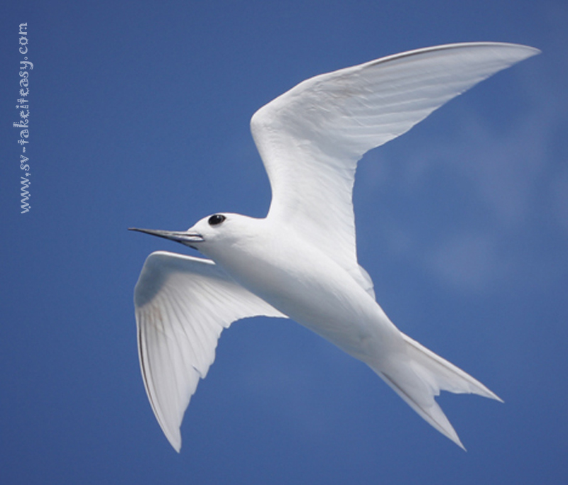 This seabird is found across the tropical oceans of the world. It ranges widely across the Pacific and Indian Oceans, nesting on small coral islands. We have enjoyed seeing the White Terns at Lord Howe Island and at Elizabeth Reef. Last year we even had the delight of having a pair spend several hours resting on Take It Easy whilst we were sailing back towards mainland Australia. They were not afraid of us and let us touch them ever so lightly.