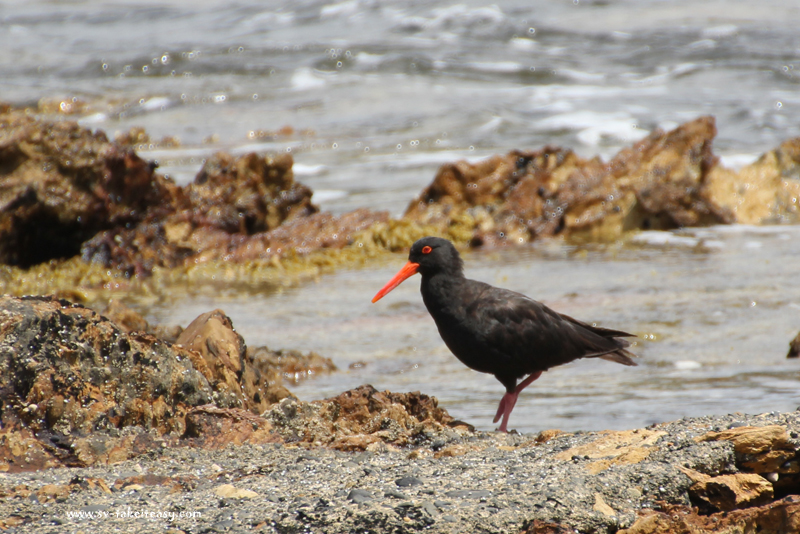 This is one bird you will not confuse with any other! The Sooty Oystercatcher, as its name suggests has an entirely black plumage. It has scarlet red eyes, eye rings and bill, and pink-red legs. It is a medium size bird of about 45cms, and its bill is long (5 to 8cms).