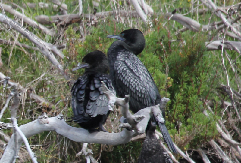 The Little Black Cormorant is a small, slim, totally black cormorant. From a distance it might look drab, but up close, the plumage on his back has a glorious sheen and shows a distinct and quite beautiful scaly pattern, while the tail is smooth, glossy black and rounded. A special reward of seeing this bird at close quarters or through a big lens is its striking blue-green eyes. It has a long slender and hooked grey bill. His legs and feet are black. The Little Black Cormorant is also known as “the little black shag”. It is 60-65 cms long and has a 95 to 105 cms wingspan.