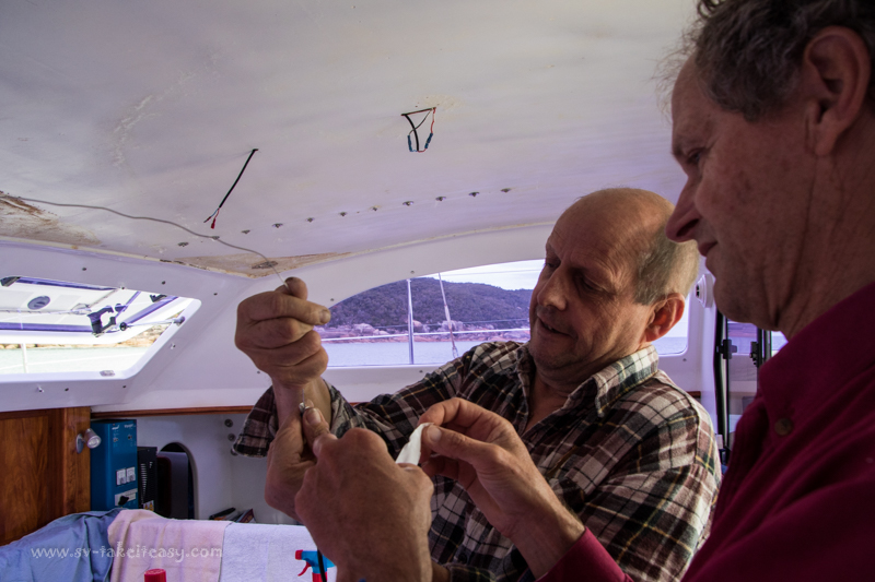 This long weekend is yet another example of the endless maintenance chores a yacht generates! Joined by Chris Guthrie, our boat building friend, we had a working weekend planned, to finish off the electrical work on Take It Easy, tackle the replacement of our cabin roof lining and carry out the annual check of our mooring.
