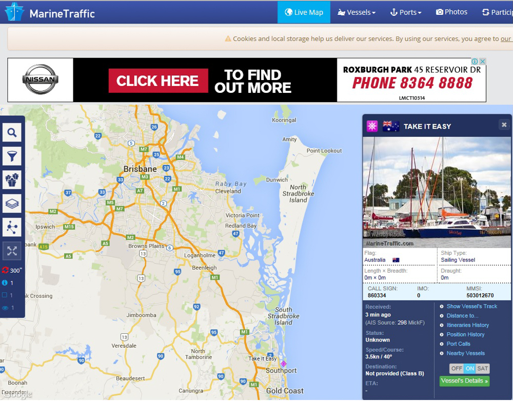 The boys have made it across the border into Queensland.  After spending a night at anchor in Byron Bay, they set off early on Monday morning, bound for the Gold Coast Seaway and the Broadwater.  Marine Traffic recorded them at Southport on Monday afternoon, and they anchored at Bums Bay overnight.