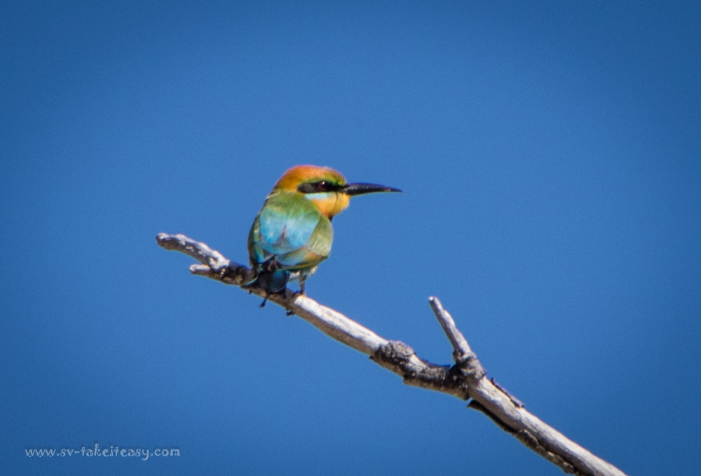 The second area we are visiting at Great Keppel Island is situated on the Northern side of the isle, at Butterfly Bay.  And you guess it, it is deserted, just as we like it, unlike the more frequented beaches on the Western side.  It is not for lack of interesting things to do there though. Butterfly Bay is a broad half moon beach offering good fishing, snorkelling at low tide, and reef walking armed with oyster knives offers a tasty feed when you manage to pry the shells open.  There are sand dunes to climb, fossicking to be done.  We see the less attractive side of beach visitors: an abandoned camp where people left their rubbish behind.  But finders keepers, Wade picks up two rather new frying pans, which once cleaned prove to be a good replacement for our old battered one on Take It Easy! The walk across to Wreck Beach, a 1 km crossing to the Eastern shore through the sand blow is hard work in the soft sand, even without the heat and humidity of summer, but the birdlife is amazing along the way. We see rainbow bee-eaters, and yellow-bellied sunbirds, such brilliant colours in these small flitting nectar-eating birds.