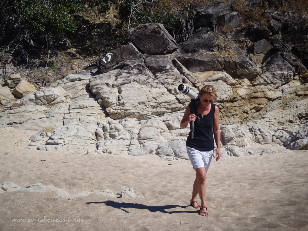 We are not disappointed! No sooner have we landed the dinghy, that we see a tiny red-capped dotterel on the beach and discover her nest, which explains her antics: “Pick me, pick me, I’m injured!” She is pretending to have a broken wing to lure us away from her eggs.