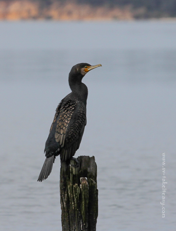 The Great Cormorant varies in size from 70 to 90cms, with a wingspan between 121 and 160cms.  His plumage is almost entirely black with a bluish gloss to it, except for a white patch on the side of the head and on each thigh. The legs and feet are charcoal.  Despite the drab look from afar, it is a striking bird with bright highlights on its face and amazing patterns in the plumage on its back.  It has a yellow face with a hooked grey bill and piercing blue-green eyes.