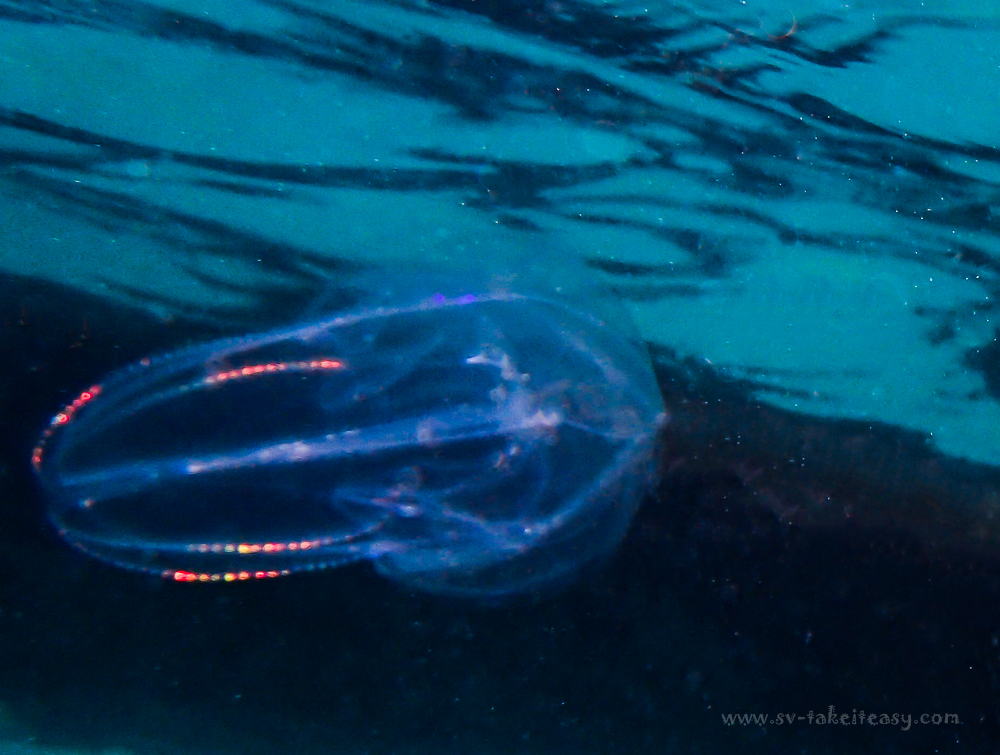 There are apparently over a hundred different species of Ctenophores.  The scientists at Jellywatch confirmed the identification of the ones we observed as the Ctenophore Bolinopsis. These aggregated in Sealers Cove, a large bay open to the ocean at Wilsons Promontory, on a full moon night.  They were drifting with the tide past our anchored boat.  We would have seen maybe 40 to 60 of them around us, but there could well have been hundreds in the bay.  The next day we moved to Little Waterloo Bay and were ready for another light show, but none were there.  It might have been a blessing, as although these creatures are very beautiful, there are fears they might become a pest, like their cousins the Mnemiopsis which invaded the Black Sea and have spread into the Mediterranean sea.