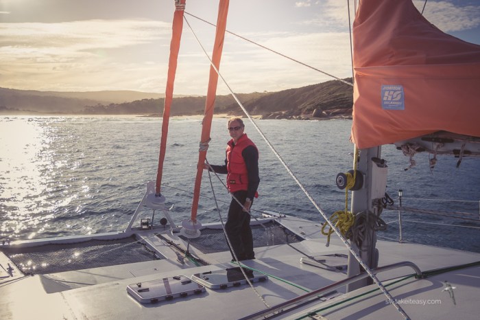 We managed to finally leave the Gippsland Lakes on Sunday 13 August before dawn and motor-sailed in light winds. We got gentle enough conditions to stay overnight at the Skerries, a group of small rocky islets just off Wingan Inlet. You get some protection from the islets, and although it is never totally calm in there, this little known spot can allow you to break the long journey to Eden and avoid an overnight sail. But if there is swell or strong wind, it is untenable.