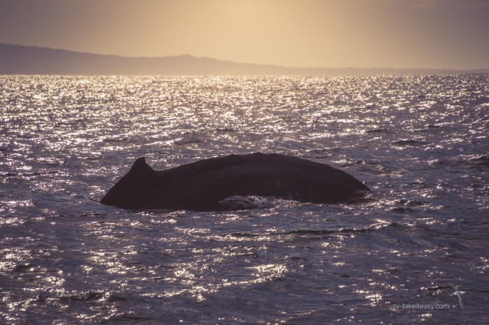 And then there were the humpback whales. It is migration season. We saw quite a few at a distance. We would notice the blow or the splashes from them breaching and tail slapping, too far to photograph but exciting nevertheless. But one surfaced so close to us that we were thrilled and scared at the same time. It was nearly as big as the boat and at 40 tons, 10 times the weight! No zoom required for that photo!