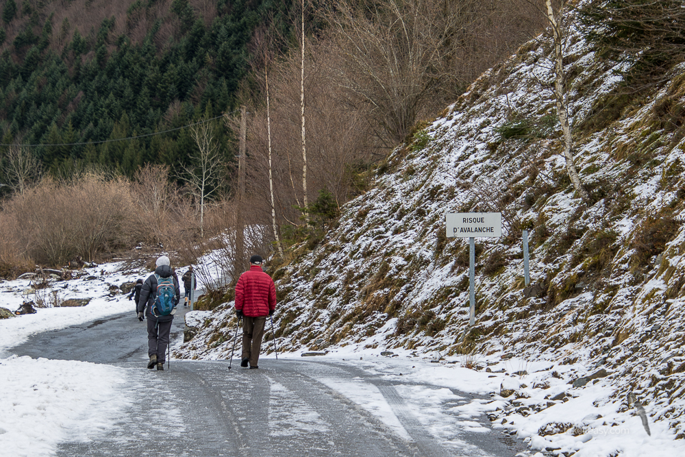 9G5A0407 Published 02/01/2018 at 1000 × 667 in Images of France: Hautes Pyrénées ← Previous Next → Véro and Dad walking back down – notice the sign: Risk of Avalachances.