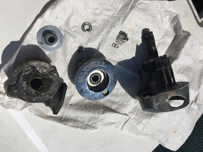 But then things turned sour just as we were plotting a trip to the reef. Our 15 year old Maxwell anchor winch gave up the ghost… ghastly grinding sounds came from the totally corroded motor and then it just stopped. “Terminal said Wade!” So instead of heading to the reef, we are at Keppel Bay Marina! The new winch was ordered on Wednesday and will arrive today, a speedy but horribly expensive exercise. There was the small matter of getting the old seized one off and fitting the new model in the existing hole. A small degree of swearing happened, but it went surprisingly smoothly.
