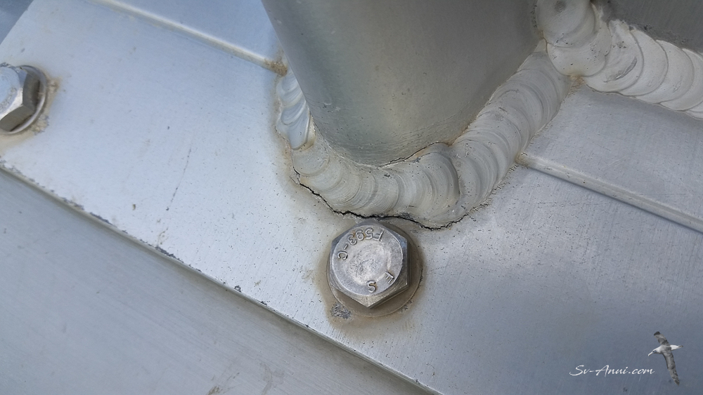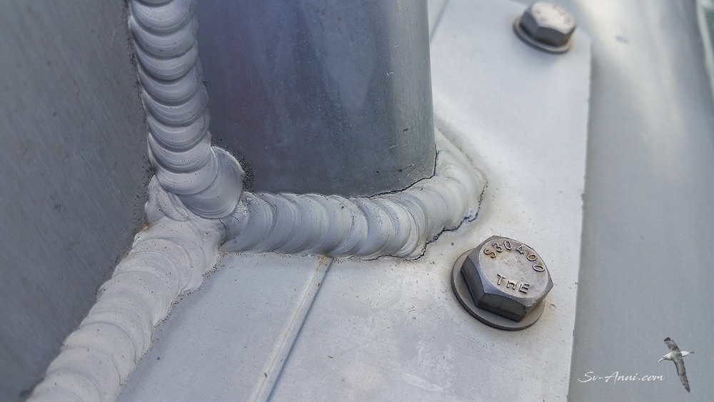 For those who don’t know, the role of the A-frame is to counter the force which the jib and forestay place on the cross beam. The forestay stops the mast from falling backwards and is what the jib furler rotates around, and the rigging on either side of the A-frame stops the cross beam from lifting at either end. So it is rather critical that the A-frame be strong! What was discovered was a crack along the welding at the base. It seems to have been there for a while but was not noticed at survey time. Have a look at these photos: