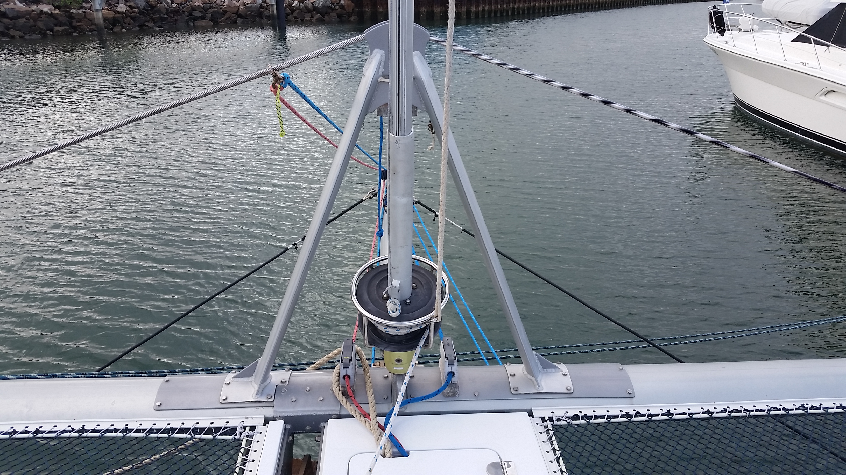 Because the A-frame is anodised it makes re-welding problematic and also does not deal with the root problem which is that it is not strong enough. The A-frame has had to be taken off, ropes attached to support the mast, and a new A-frame needs to be made by the local rigger, which will take a couple of weeks. So no sailing for Wade! All he can do is motor. He has decided to get out of the marina for now and go and anchor around Moreton Bay to minimise costs. He will return to the marina in Manly when the A-frame is ready to be installed.