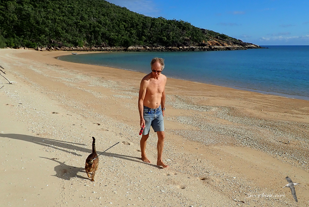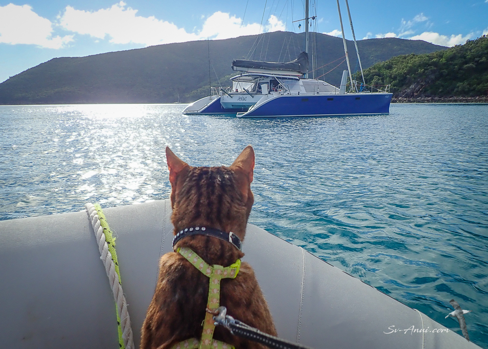 We got to Scawfell Island on Saturday afternoon, and tucked ourselves in. We had the most comfortable night at anchor for weeks! Waking up to birds singing on a calm, sunny morning was really special. We took Bengie for a beach walk, the first in at least six months. As soon as we put her harness on, she was ready! Hopped off the dinghy and started trotting, scratching in the sand, sniffing, with lots little happy meows. But she got tired quickly and we did not hear boo from her for hours after that!