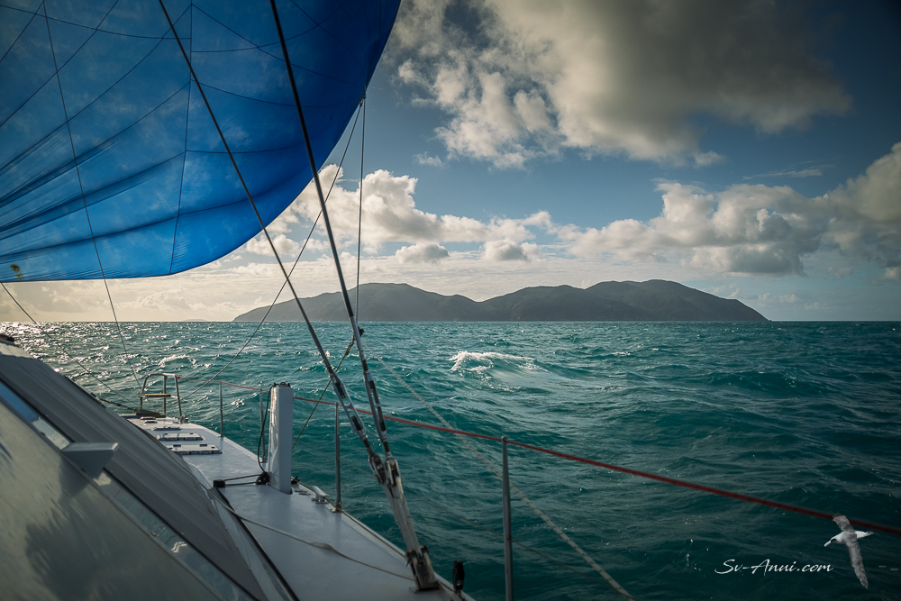 For the full 170 nm passage to the Southern Whitsundays, there is a range of possible overnight anchorages along the way. As soon as we left Rosslyn Bay, the conditions were rough. Lots of wind, agitated seas. We would have thought that with nearly three weeks of persistent south-easterlies, the downwind run would be quite smooth… Not so, we could only describe the ocean as chaotic: worse than a Bass Strait crossing – short, sharp seas, lots of breaking waves.