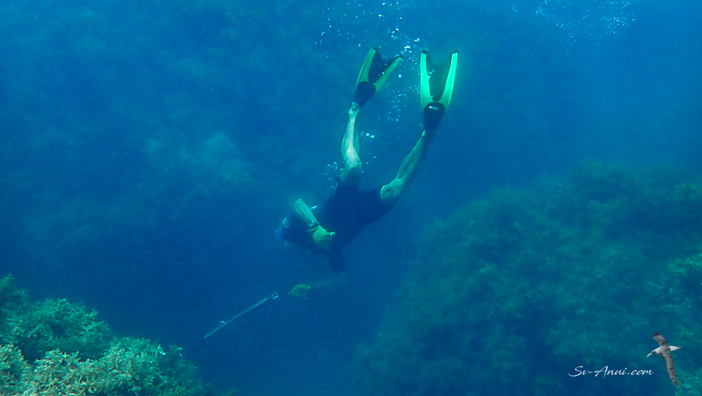 Connie Bay on the northern side of Keswick was our next dinghy trip from the anchorage. A feature of this site are the deep narrow canyons in the reef, where all sorts of fish patrol, some rather big! So Wade was ready with his speargun again, even put champagne in the fridge in anticipation of a big catch. Nothing caught! Wade was very disappointed and is still sulking. But I caught him in action at least!