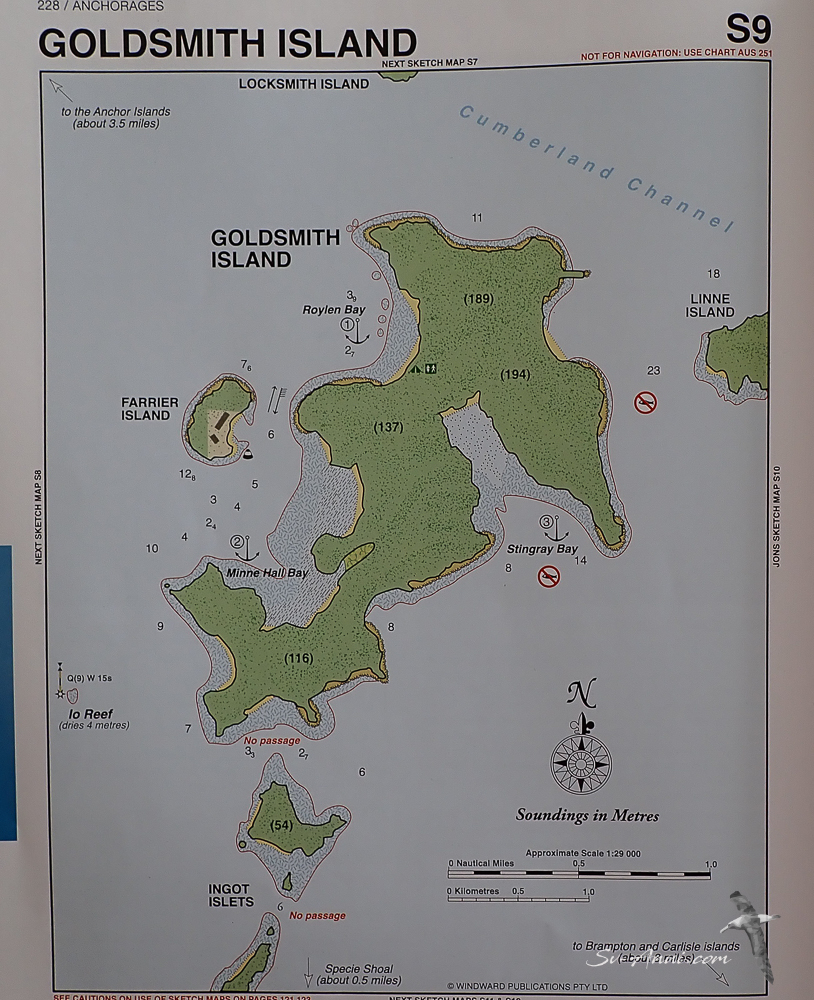 For our third post in the Southern Whitsundays Series, we take you to Goldsmith Island where we spent a few days waiting for the strong southerly to calm down and sunny conditions to return. It was threatening with rain when we left Brampton Island for a downwind sail of about 12 miles under jib alone. We passed between Goldsmith and Linne Islands and anchored at Roylen Bay.