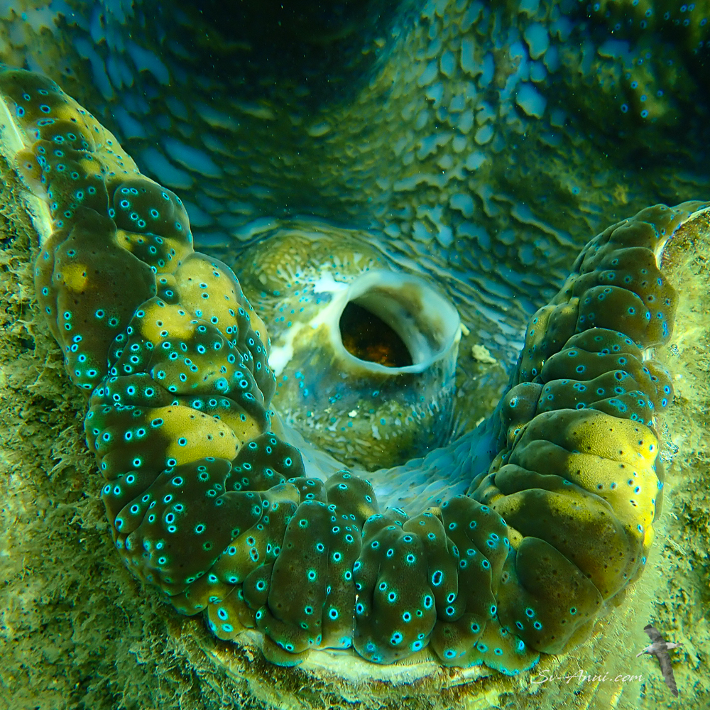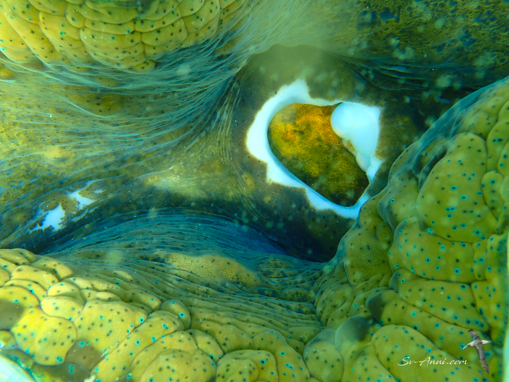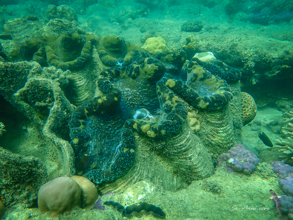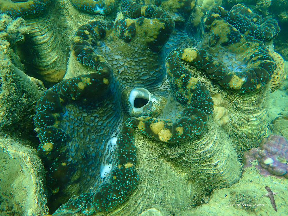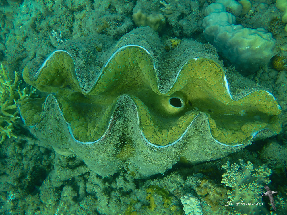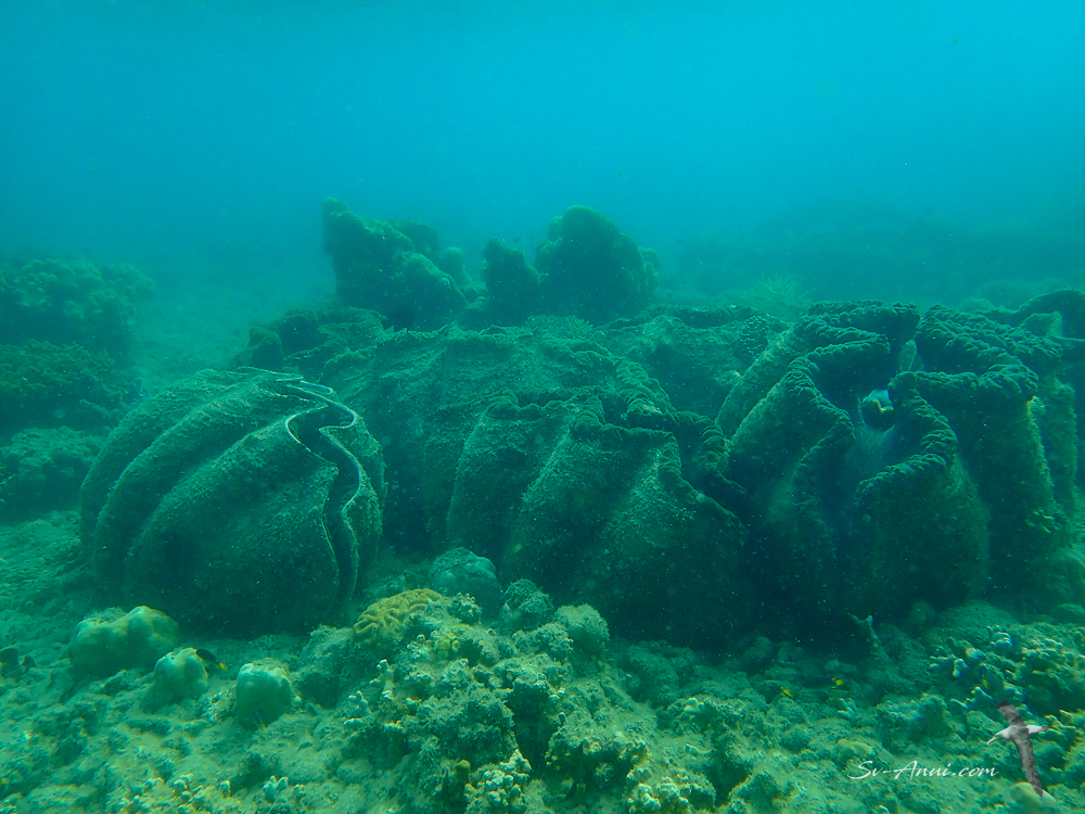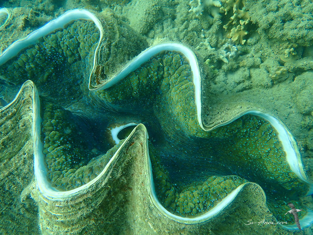 There are now hundreds of the true giant clams, each weighing 150 to 200kgs, and stretching between 90cms and 130cms in length. These are three to four times the size of the small giant clams – tridacna maxima – which we have photographed so often.