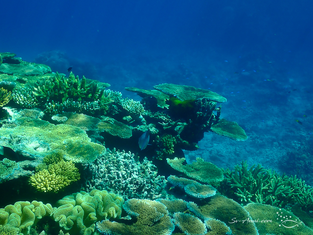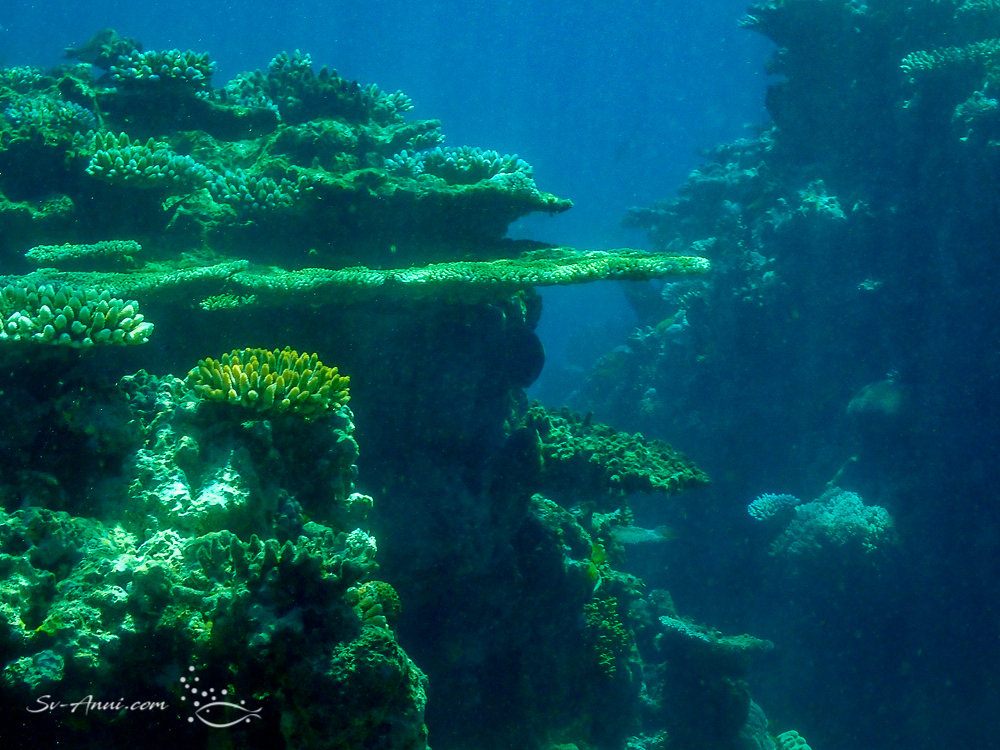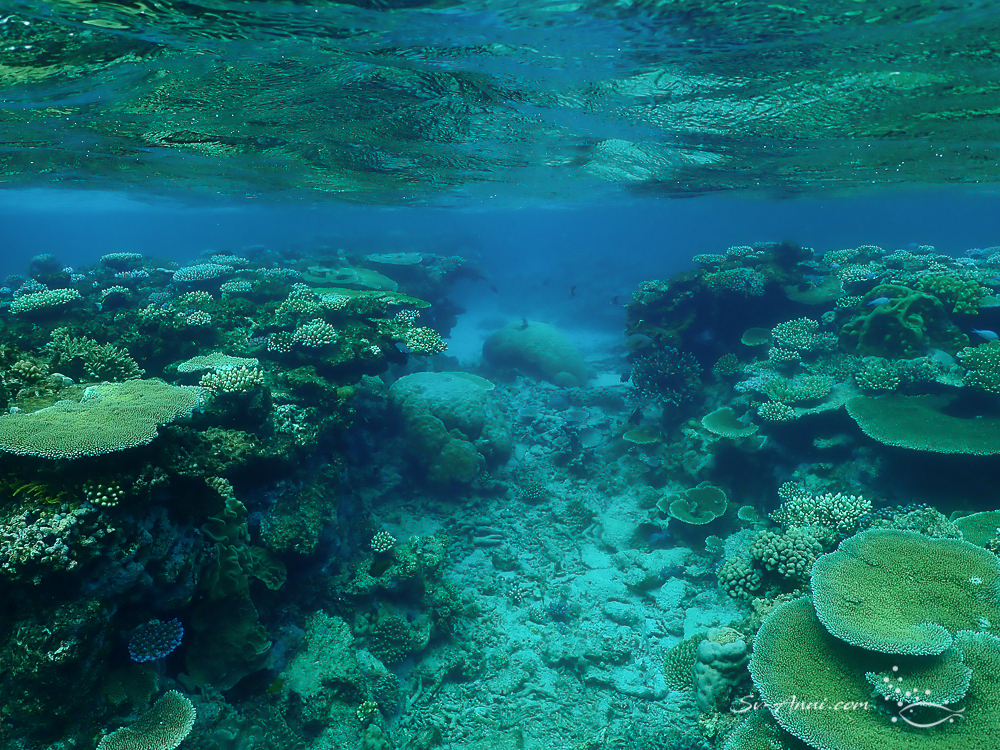 It is the sheer size of what you are navigating through that seems most striking here: huge boulder corals, terraces of coral plates, deep trenches, big drops, and all surrounded by deeper water. You do have to dive down further, but it is so worth the effort. And the water is so blue and so clear!