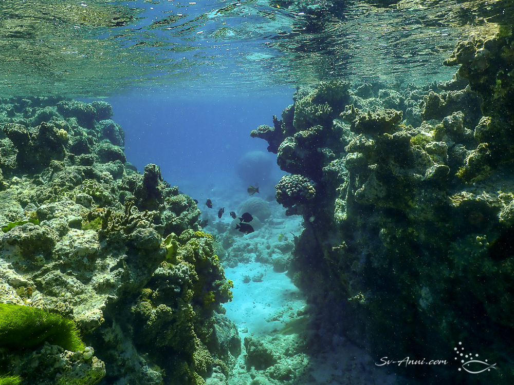 We are both very conscious Norman Reef is huge, and with clear water it is deceptively deep around the edges. But there is also a maze of gutters, some of which meander through very shallow areas where the coral heads stick out of the water, while others lead to dead ends. It is vast, a little more daunting than usual, especially in the chop and wind, and we continually surface to check our position in relation to Anui.