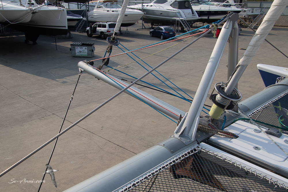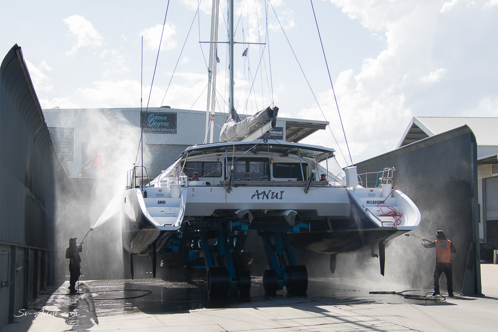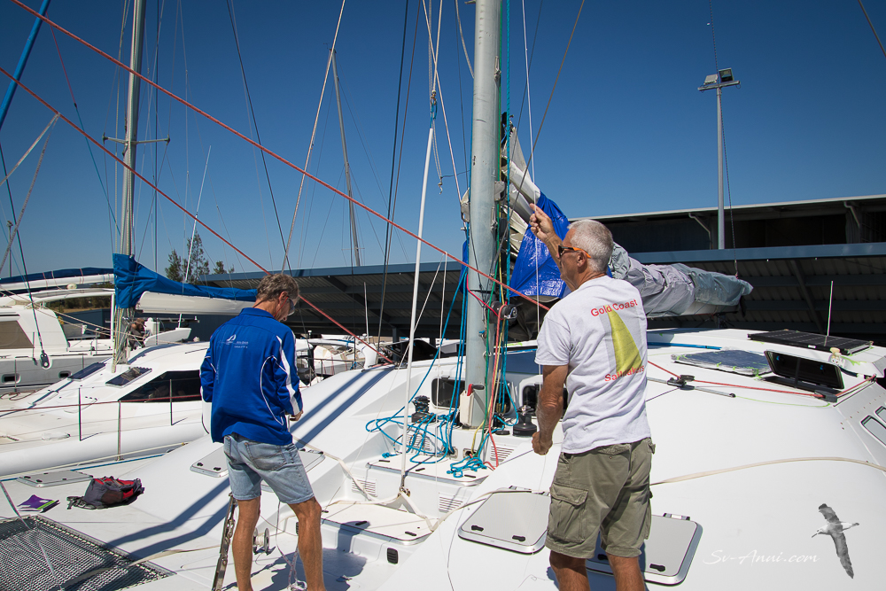 Scott Keogh from S K Yacht Rigging is replacing the lower tangs on the rigging, changing the worn water stays that support the prodder, improving the way the prodder is set up so it can be more easily folded up when in a marina, and tuning the rig. We have been sailing Anui very conservatively until now knowing the rigging needed attention and of course also learning to handle her. But now we have the green light from Scott and from our marine surveyor Geoff Cruse to push her a bit more! “You are not going to let monos and other cats overtake you, are you? She is capable of a lot more than you have ever done; giddy up!” I am game, but Wade is a lot more conservative than I am. We’ll keep you posted on that little challenge!