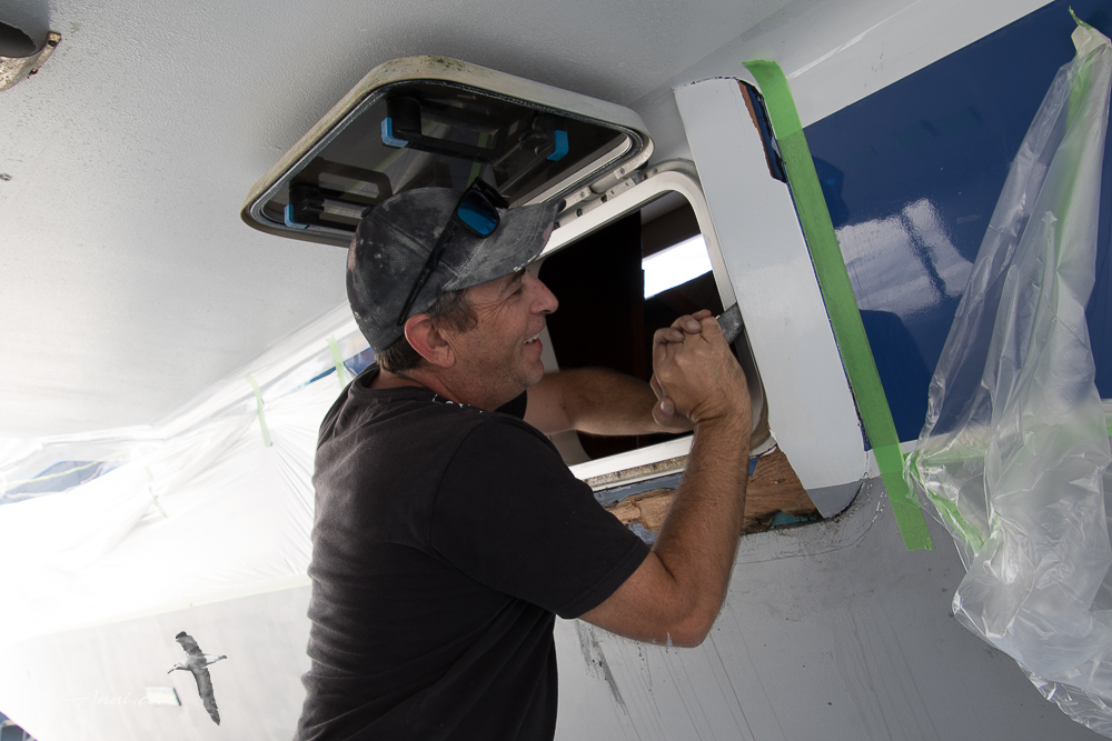 Our shipwright Ryan Thacker and his team from 143 Boat Building had the lion share of the work. They have attended to our reef sins, done a cut and polish on the hulls, some touch ups to the paint work on the cabin roof and the hulls, and have sprayed new anti-foul. The boat looks amazing. They are also addressing two unexpected discoveries: some delamination near the base of the mast and suspect weeping around one of our escape hatches. The delamination got fixed easily. As for the escape hatch, the cedar moulding around it had to come off to investigate and revealed an area where the sealant had given way and water soaked into the moulding. It has been cleaned up, bogged and will be put back on properly and repainted this week.