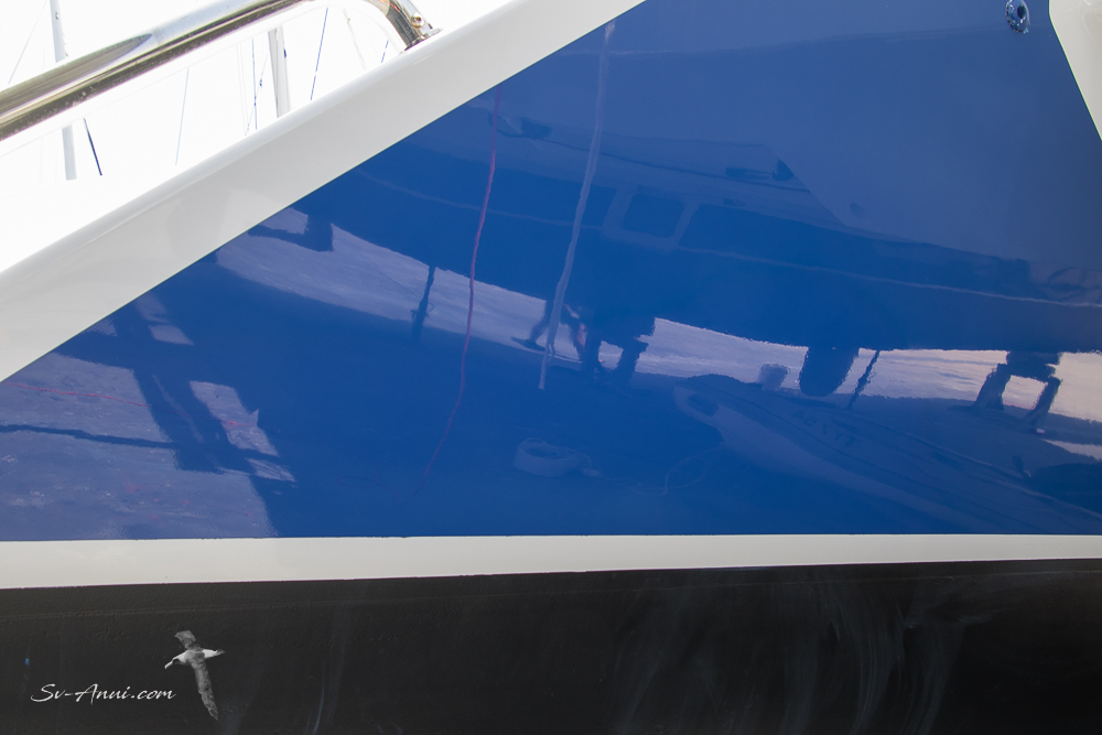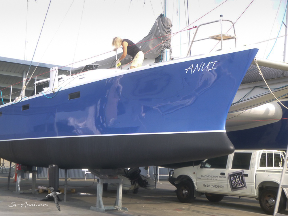We had scratched the inside of one hull with the dinghy outboard propeller, and it really irked us. And then some stink boat who had anchored too close to us put a ding on the outside of the hull at Paradise Point – that was it: can’t have Anui looking battered; all scratches had to go! Thanks to gun painter Geoff who normally works on luxury yachts for being even more fastidious than we are! We were referred to him by our shipwright. He did a superb job: we can’t see where he has been. Wish we had used him on previous touch ups! We know who to go to in future.