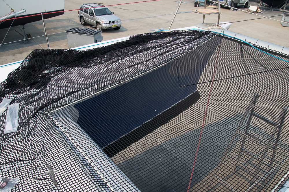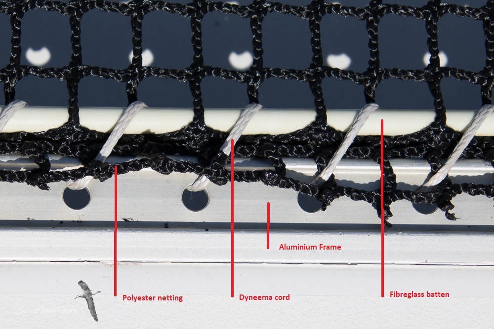 We completed the installation of our new nets! What a hard job that was: we were at it for nearly three days in full sun and 38 degree heat, precarious too with the height off the ground! Our nets are made of polyester mesh, threaded through fibreglass battens and are laced to an aluminium frame with dyneema cord. We bought a large 5m x 4m length of polyester netting to do the job and used our hot gun to cut each tramp to size.