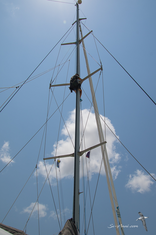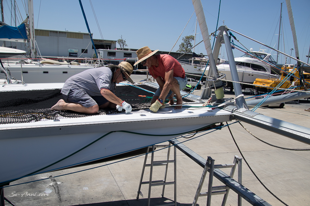 The crucial job of replacing the lower tangs on the rigging was done on Monday morning by Scott Keogh of SK Yacht Rigging. It was a bit close to the deadline, but we got there! Scott also changed the set up of our prodder so we can easily fold it up if we go into a marina, and checked the whole rig, declaring it sound. Now we have the green light to push Anui a bit more… “You should easily do 20 knots boat speed” said the rigger and marine surveyor. This seems a little scary to us, but we expect to beat our current speed record of 13.5!