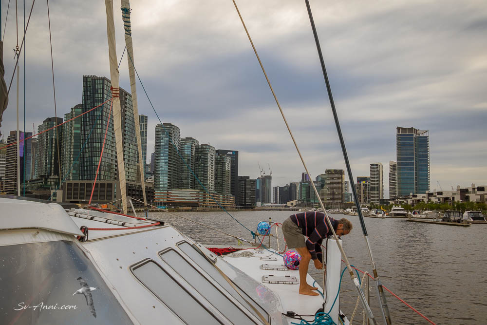 Nearing the Docklands and Yarra’s Edge – Wade gets ropes and fenders ready!