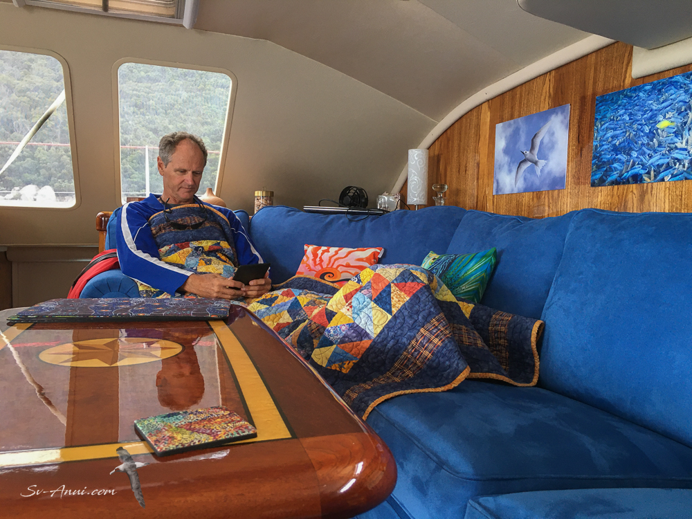 Also alternating is the dress as the weather and temperature go from wintery when we rug up like little oldies and don’t dare go ashore, to warm, sunny days when we sit in bathers in the cockpit! On the cooler days, things look like this inside Anui: