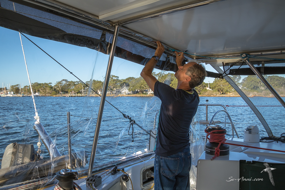 Wade has thrown himself into a few boat projects. He has been refining systems on Anui and looking for ways to make our life more comfortable: protecting the cockpit from rain (normally not needed when at anchor, but necessary when you are at a jetty), lining up the installation of a Telstra mobile signal booster to improve our ability to stay connected even in remote areas.