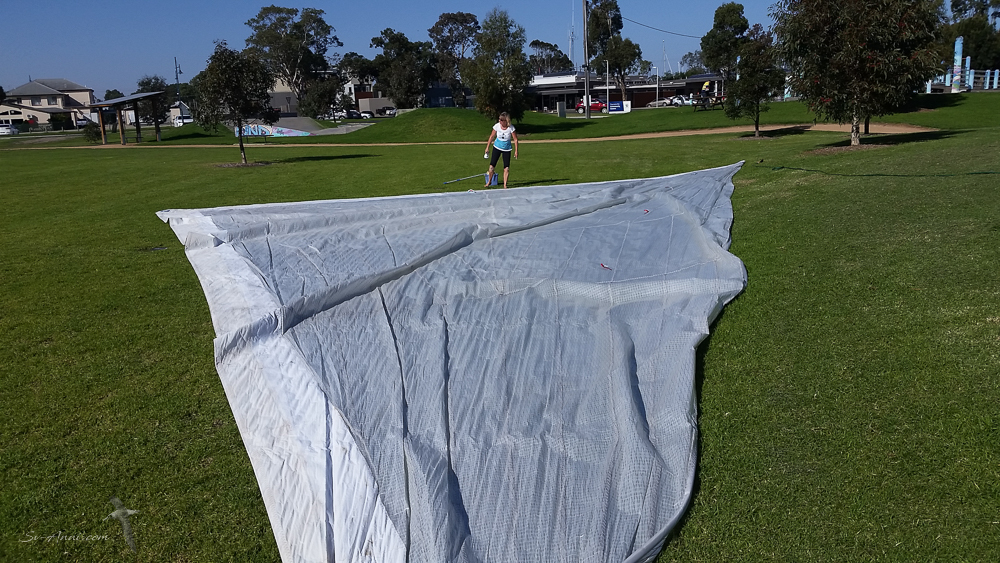 We had cleaned the mainsail at Yarra’s Edge, but now it was time to tackle the screecher, and the jib will probably be next! The staining was not pretty, and particularly disappointing since both the main and screecher were new sails! We managed to roll the screecher, fold it, drag it in a trolley to the local park, spread it out and we connected meters of hose to the BBQ tap! We drenched the screecher, soaped it up, and scrubbed away for a couple of hours. All this hard work was accompanied by copious amounts of old people’s noises, and you could have mistaken us for tourette syndrome sufferers with the amount of uncontrolled movements, screams and swearing that escaped from us, but it was all caused by the dozens and dozens of biting mozzies!