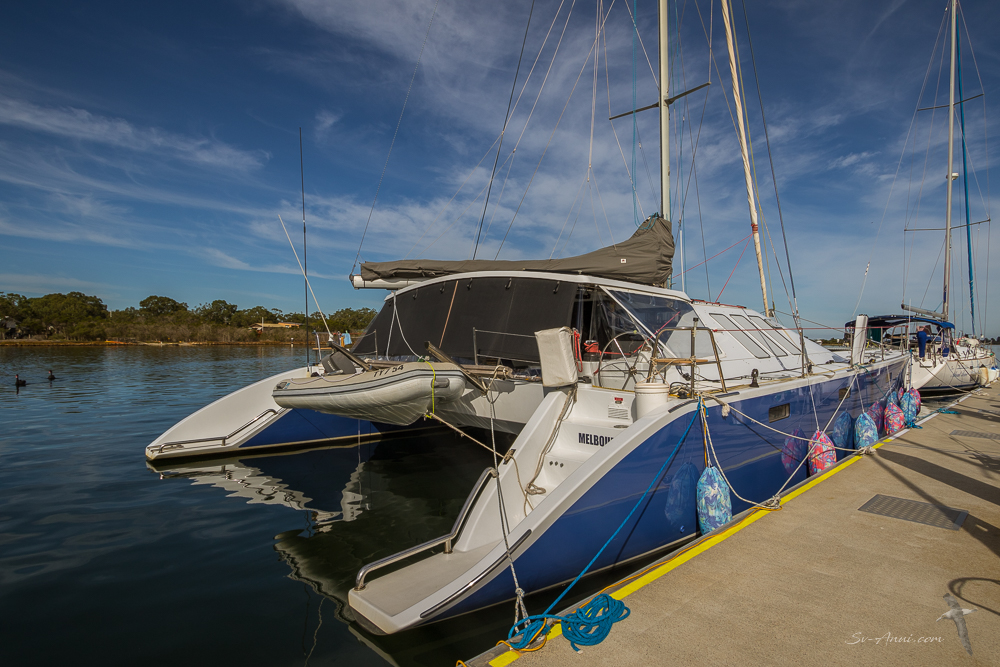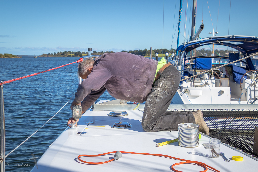 Our old shipwrights from our previous cat Take It Easy, Frecheville Heaney Boat Builders, repaired the port bow cleat that was damaged when we weathered a few storms too many at the Anchorage Marina in Williamstown last January. This involved removing the loose cleat, enlarging the fixing holes, refilling them with epoxy, reglassing the base, spray painting it and refixing the cleat. James and Tim did a great job, much better than we could have, and we enjoyed renewing our custom and friendship with them. Being ‘at work’ they were allowed on board and we were also able to show them our pride and joy. It is always interesting how shipwrights look at a boat… nothing escapes them, good or bad, and we are very pleased to say they were impressed with Anui’s construction and finish inside and out.