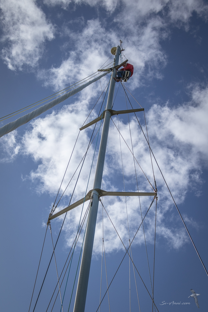 Here is Wade at the top of the mast, working on the attachment point on the top spreader for the aerial. It is a long way up there and he has to be extra nice to be lowered back down!