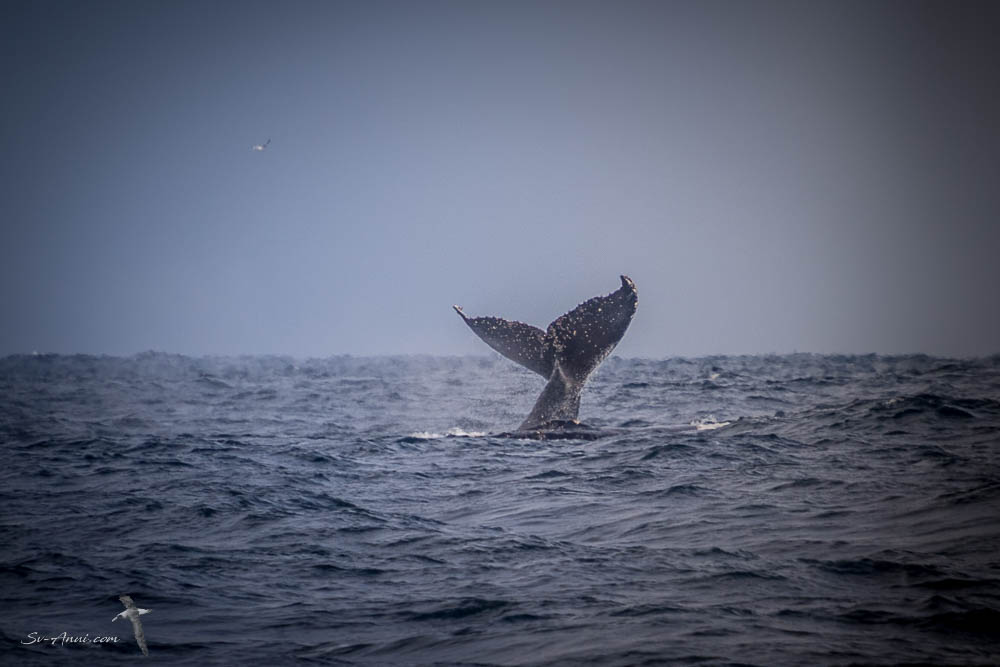The whales were active and made us aware of who was boss! We saw several lobtailing repeatedly, an activity in which they stick their tail out of the water into the air, swing it around, and then slap it on the water’s surface. Their power is awesome. You just hold your breath as you sail past, click away with the camera and hope a few shots will come out! You also feel very privileged to witness these moments from your own boat. The purpose of lobtailing is unknown, but may be done as a warning to the rest of the pod of danger – a passing Anui for instance – another form of communication, or to loosen parasites on the skin of the tail. Humpback whales lobtail more when the seas are rough and stormy and their songs are difficult to hear, which explains why they seem more acrobatic when the ocean is agitated than when it is calm.