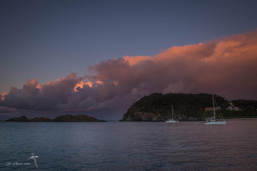 Sugarloaf Bay at Seal Rocks is a really pleasant anchorage, nice and protected in a southerly and would be good too in a westerly. Two other cats were anchored in the bay but there was plenty of space. We threw the pick to the right of them and were very comfortable. And having had the engines ticking along for a few hours the batteries were fully charged and the water hot for a shower! We would have liked to linger and explore ashore the next day, but with a northerly forecast on Tuesday, we only stayed overnight.