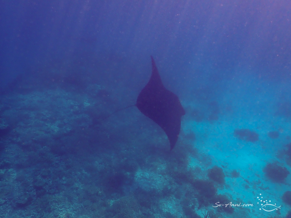 They are large, averaging about 5 meters across their wingspan. When they swim towards you, you feel rather dwarfed and have to remind yourself that they are filter feeders, not carnivores! They swim with their mouths wide open, drawing in zooplankton and krill which they sift through rows of tiny rakes that line their mouths called gill plates. Manta rays make regular visits to cleaning stations – spots on a coral reef where sea animals go to be cleaned by smaller fish. So when you know where that spot is, you are in luck, as they stay still for several minutes while cleaner fish remove parasites and dead skin. The cruising couple we met, Wendy and Alex from Gipsy, knew of a spot outside the reef wall, so we were keen to go with them. When we went there, initially we saw nothing… We were in deeper water, about 10 meters, at high water slack, to avoid being in swift current, and we were just treading water for a while, looking, looking! And then all of a sudden the show was on: 4 or 5 manta rays appeared from the deep. They were doing a circuit, following one another.