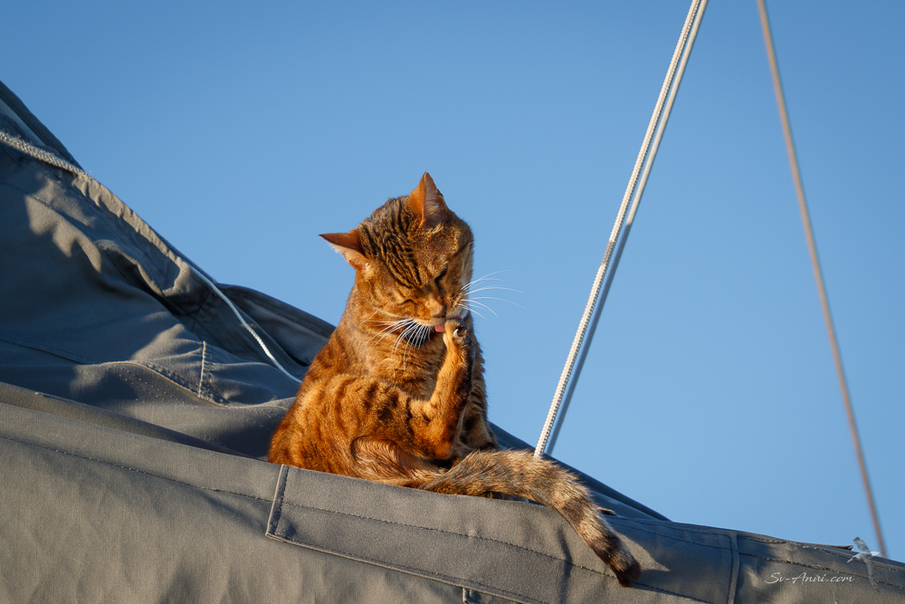We have lived on a boat for more than three years. I enjoy this life which is just as well because I don’t think my humans are intending to go back to land life in a hurry. Sometimes they think I might be bored, but I am not. I like nothing better than sniffing the sea air from the deck of our boat, or surveying our surroundings from the top of the boom. Anui is my home, I can move around as I see fit, there is no nasty dog chasing me, I get treats, lots of cuddles, blows on the tommy from my Dad. I can play chasies and hide and seek. I especially like to hide in the engine lockers, although I get into trouble for going in there! And dinghy rides to the beach are fun too!
