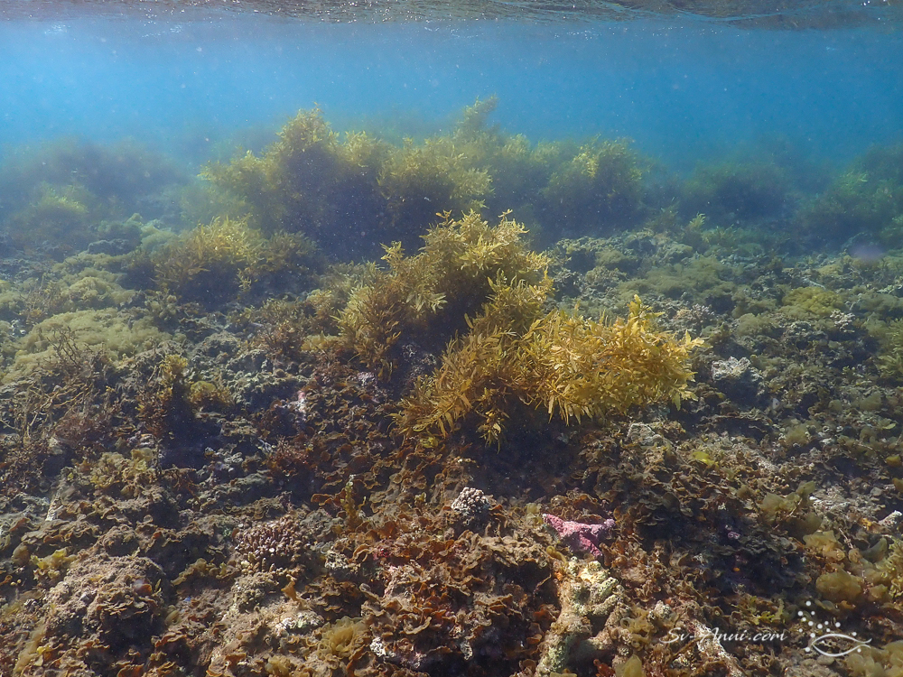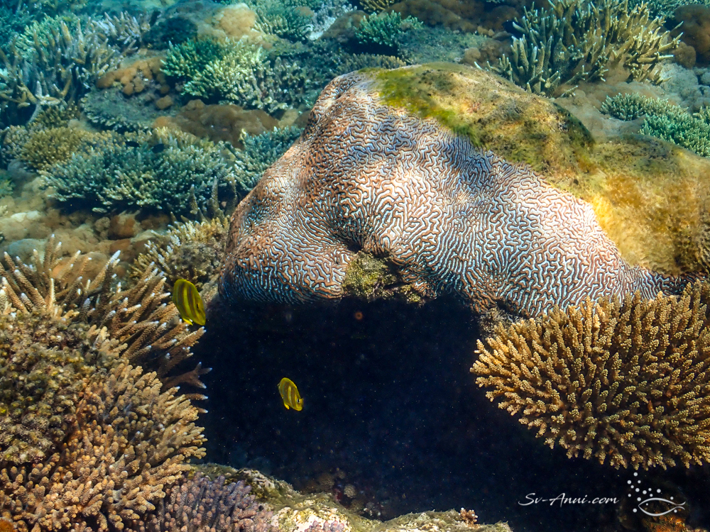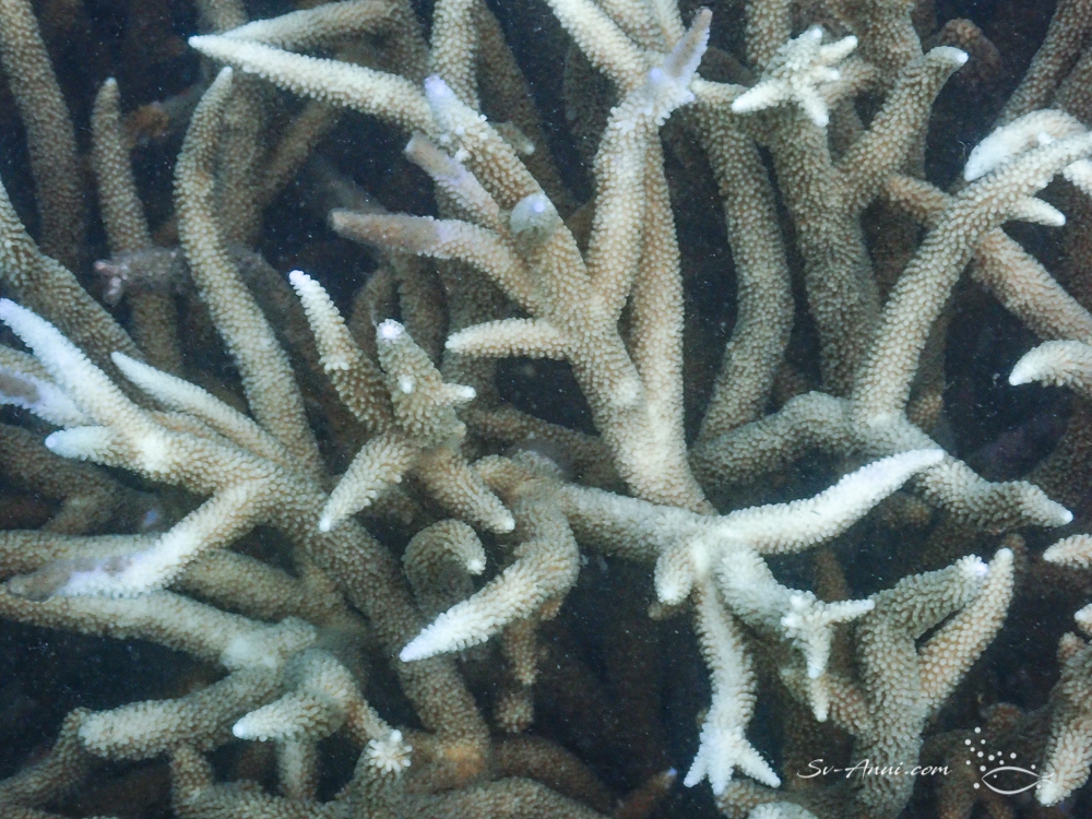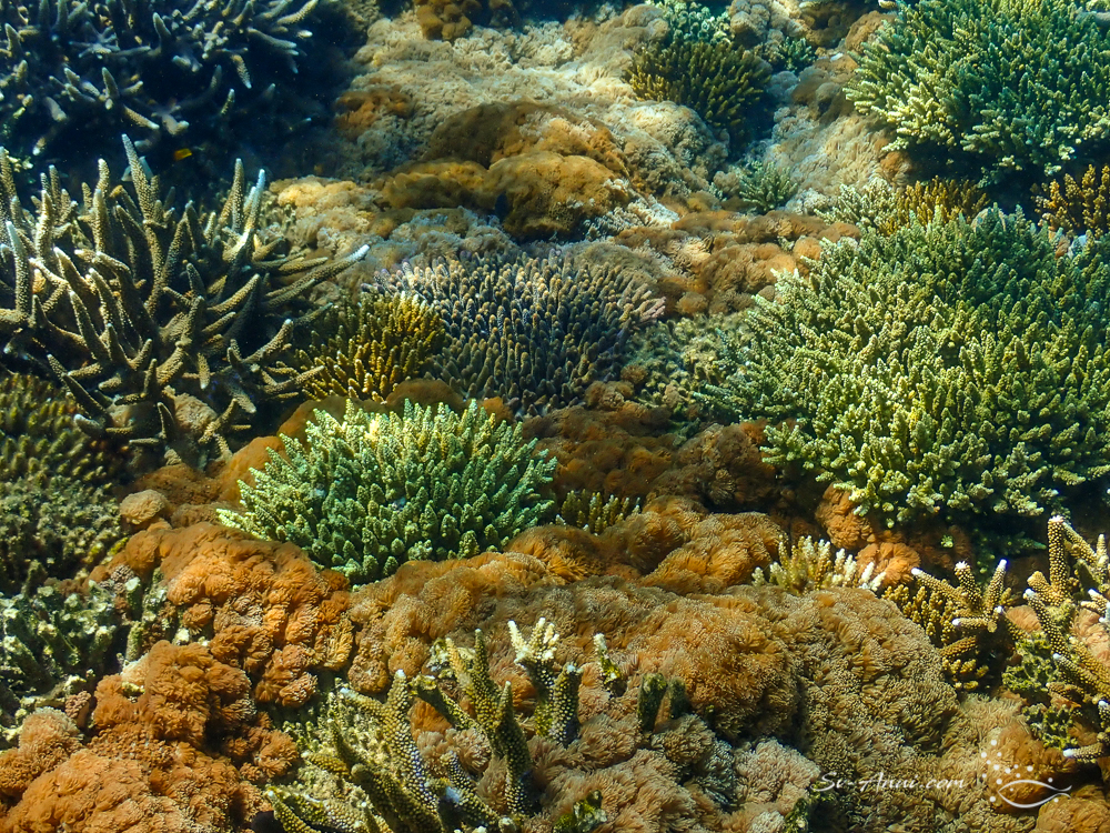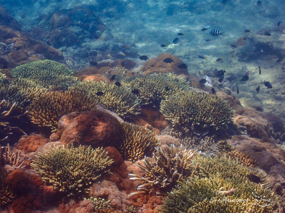 Our favourites Monkey Reef and Big Peninsula have been affected. We had to go there to see it for ourselves. It is so upsetting. Once vibrant, the corals show patchy bleaching all over and in areas algae is smothering what is left, something that had started last year. The fish are still numerous, but this is what the coral fields look like: