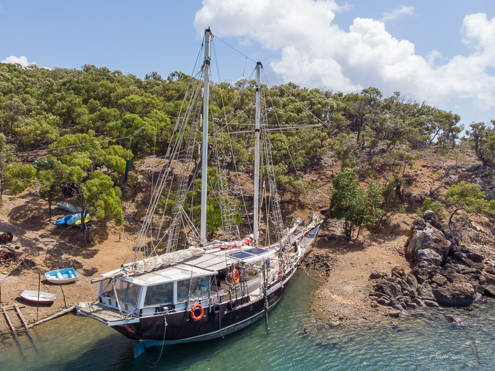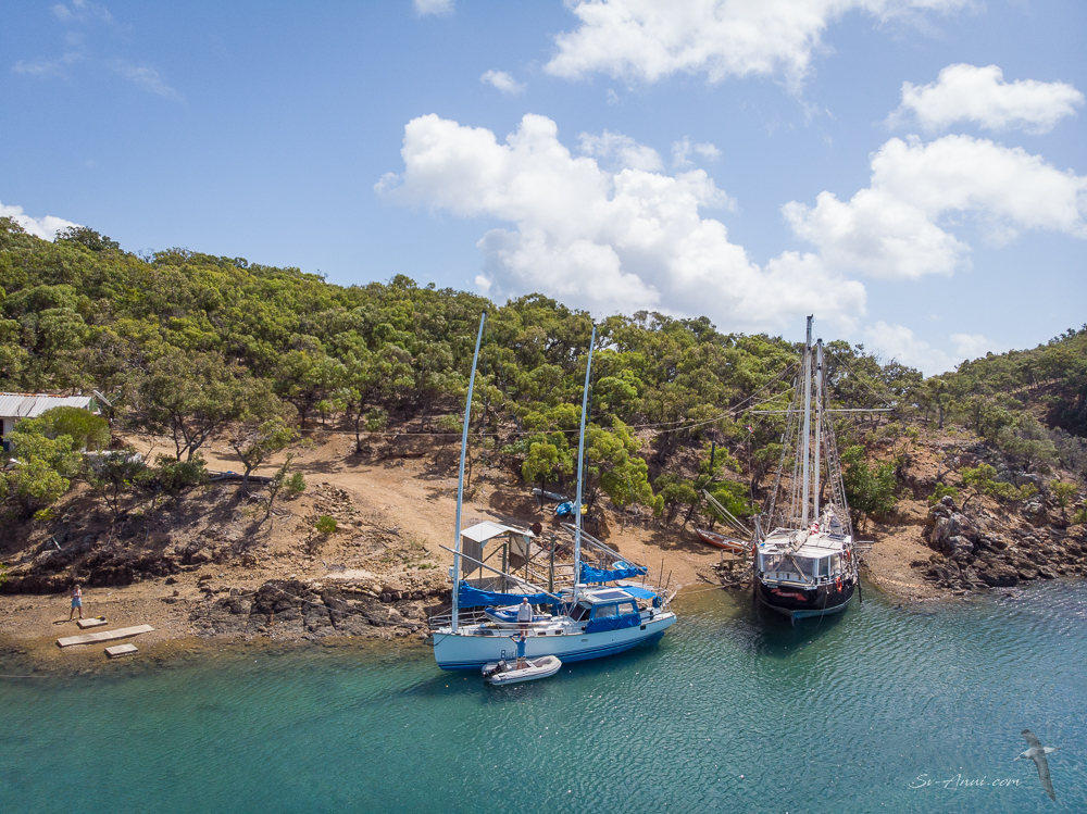 We even got the drone out for shots of the little lagoon where a few boats were sheltered among the mangrove, high and dry at low tide. Definitely not a spot for Anui. And a schooner belonging to the new lease owners is also tucked in there, precariously held in place with ropes to the shore including lines from the mast to stop the whole thing from leaning over!