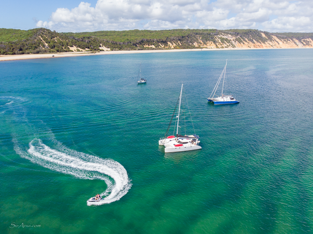 The Double Island Point lagoon, just deep enough for a few catamarans to anchor in. Bossa Nova and Anui looking smart together.