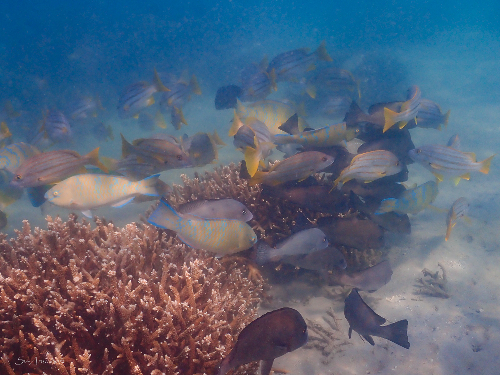 Arriving at Monkey Beach, Great Keppel Island, exactly at low tide for a snorkel! Despite the bleaching event earlier this year and the invasion of algae, the fish life was abundant.