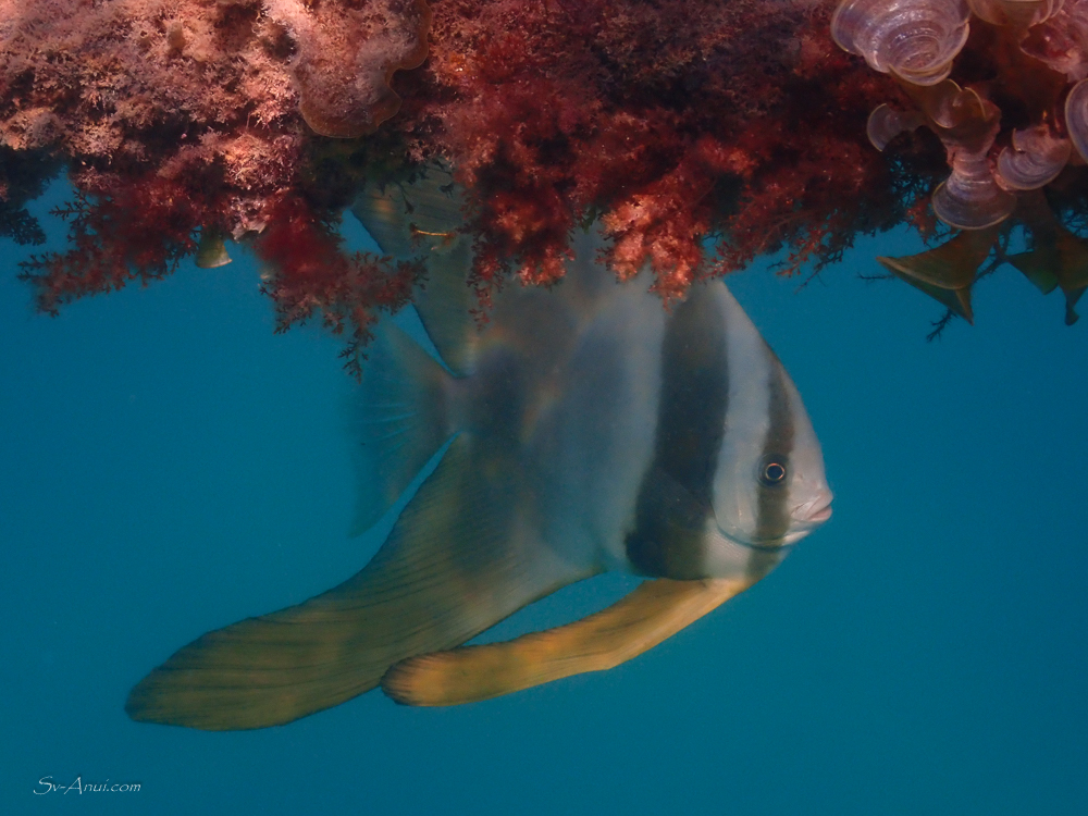 Finding this beautiful little juvenile batfish, playing hide and seek with our mooring line.
