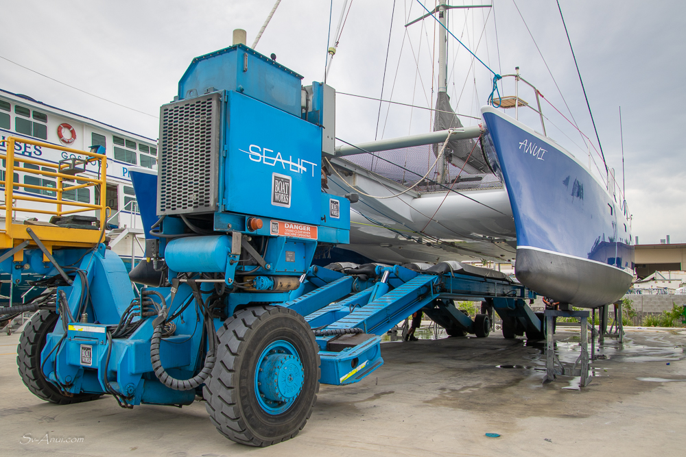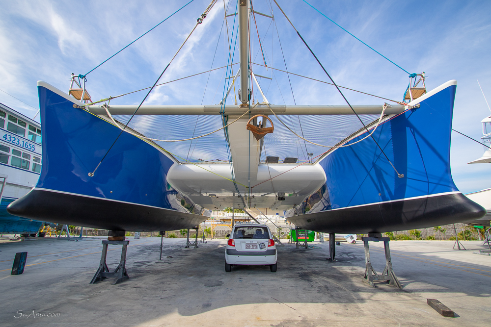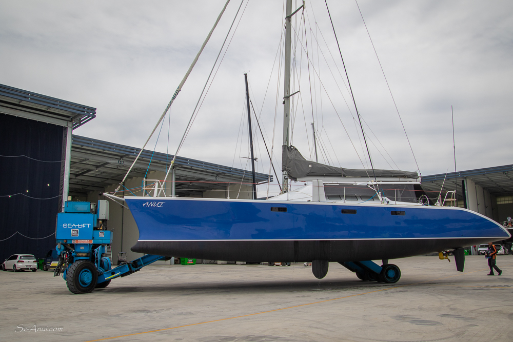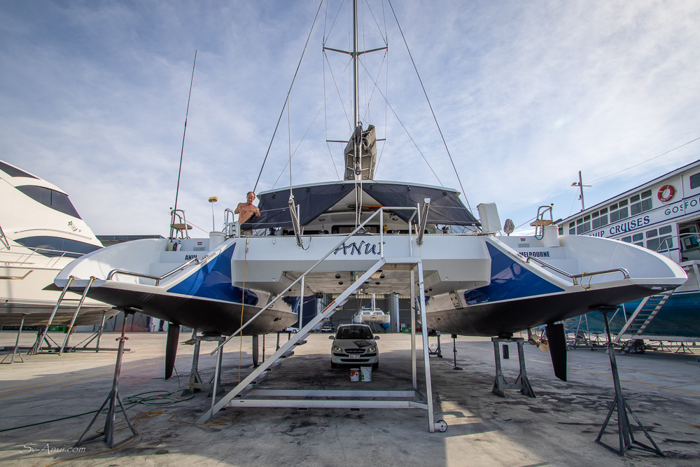 It is always interesting seeing the boat out of the water… you get a different feel for its size and lines as a few of you commented last week. We particularly like the wide angle shot with Anui dwarfing the courtesy car we borrowed for the weekend!
