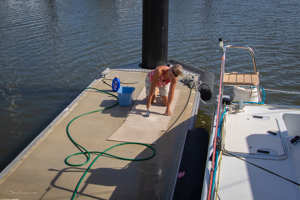 Although back in the water, we stayed at the Boat Works precinct in a wet berth for three days to wait for a few more things like our daggerboard and new sail bag. But to be honest, we were quite happy to stay a little longer: no rush, no pressure, access to the facilities, a lot more comfortable than on the hard stand… worth the extra money! And we still had a few things to do. Now that we were away from the dust, Wade cleaned the dirty black footsteps off the decks with engine degreaser, then scrubbed the decks with Boaties Gold, a combined wash and wax product, and finally buffed the top sides with Meguiar’s Deep Crystal Wet Look so the whites are as shiny and conditioned as the blues. No chalky paint on this boat!