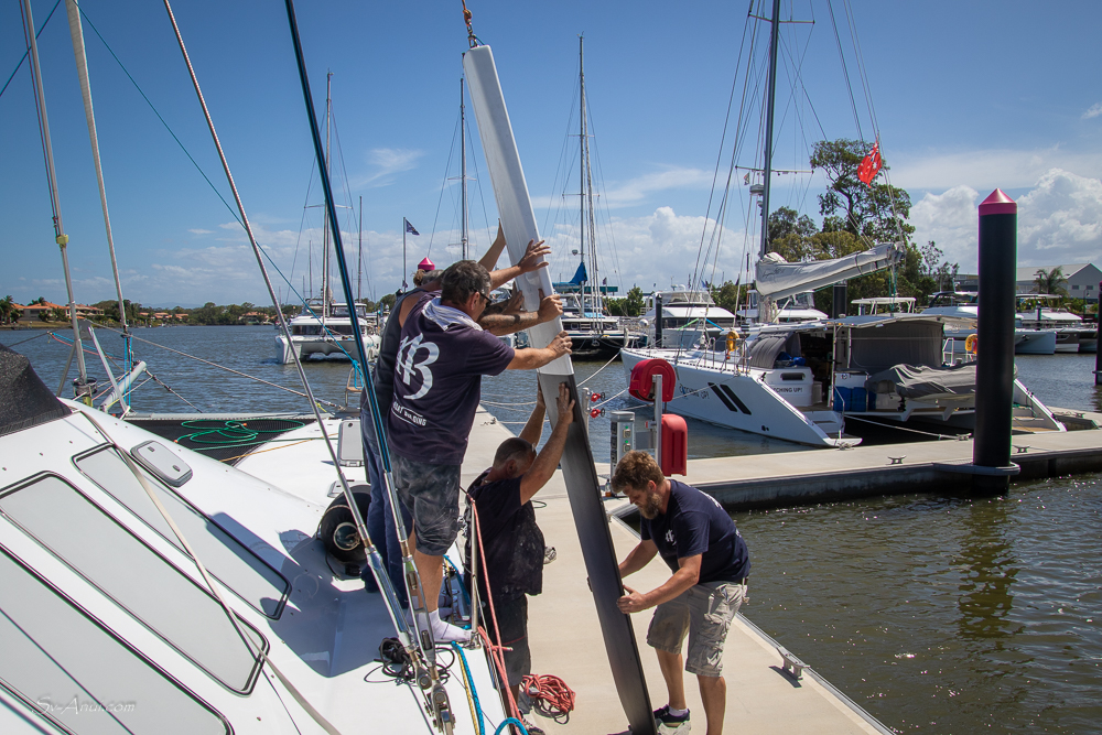 On Thursday our daggerboard came back! It took quite a team to bring it to the boat and slide it back into its well. It is a heavy piece of solid cedar. But it was a great opportunity to thank everybody for looking after us and Anui.