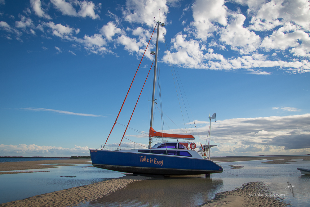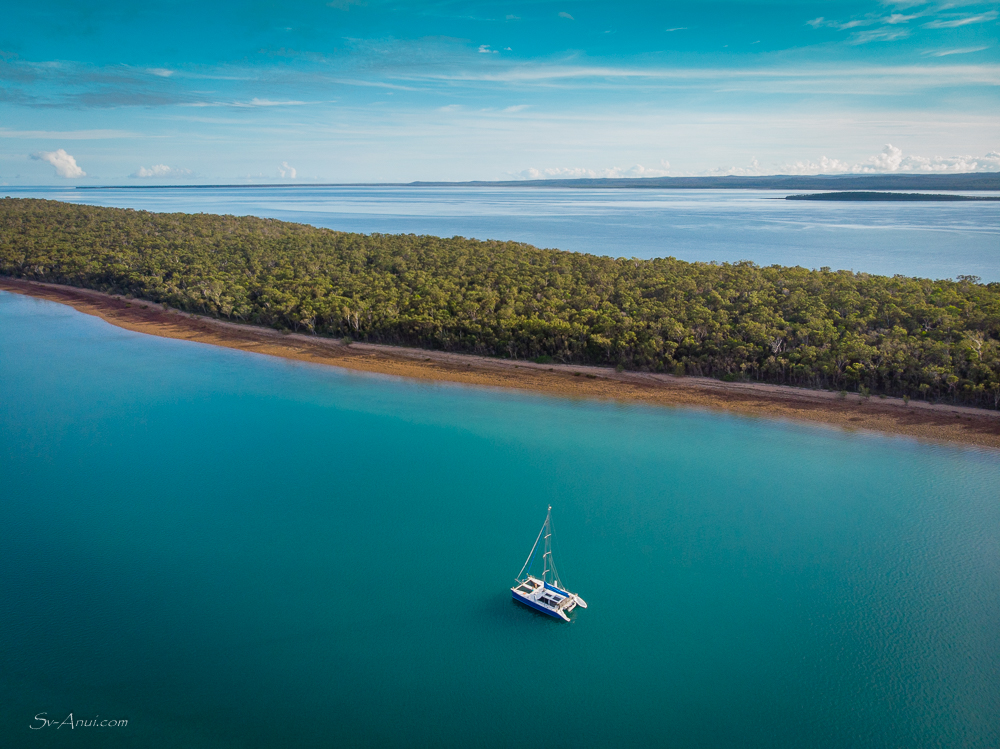 The Double Island Point Lagoon was busy: there were already 7 boats anchored inside when Anui, Sengo and Seahorse arrived, having come through the Wide Bay Bar in indian file. It was sunny but a little too blowy to launch the drone from the deck (well actually easy to take off, but a high risk of a water landing on the way back), so since we were keen to get a few shots of the lagoon from the air, we dinghied ashore and launched from the beach. You can guess which one Anui is – the only blue boat in the middle!