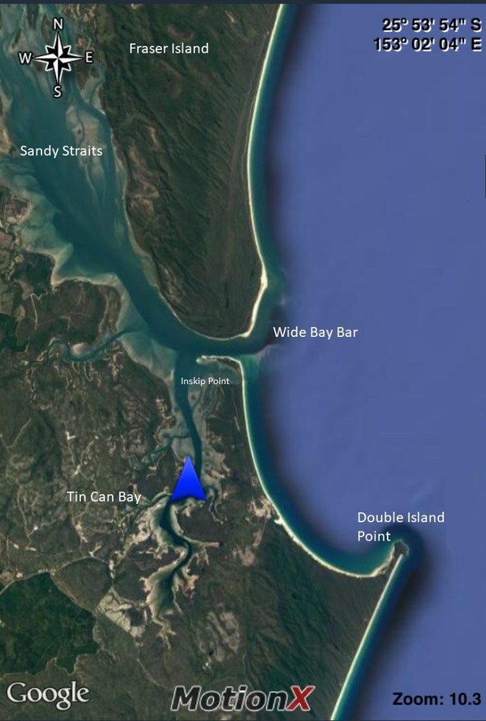 The plan was to sit out the bout of strong and soggy southeasterlies then as soon as the wind eased and changed to the east and northeast, head back south to The Boat Works. We made our move on Tuesday at last in the company of our friends from Sengo, although the wind never eased as forecast! We had to motor all the way to Tin Can Bay but at least we escaped and picked up some fresh food and treats there! The next day saw us sailing back to Inskip Point with the ebbing tide, and out through the Wide Bay Bar to the lagoon at Double Island Point on Thursday. This satellite image shows an overview of the area. The blue arrow is Anui, anchored at Tin Can Bay on Tuesday night.