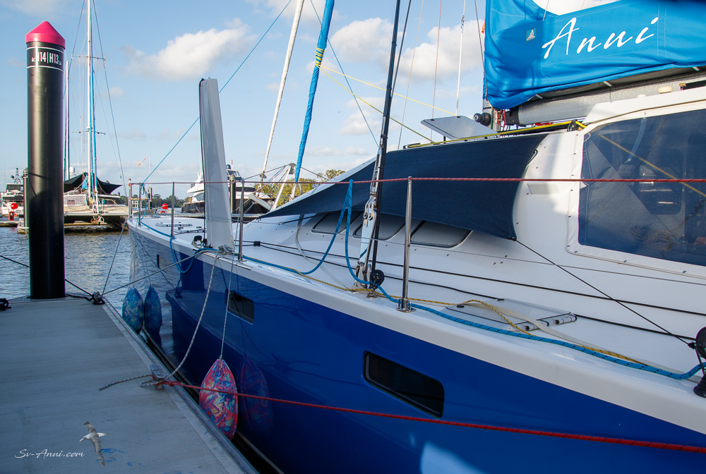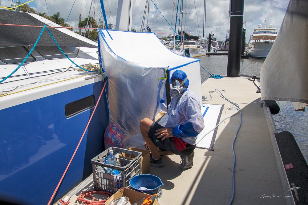 Finally, things have fallen into place. Anui looks resplendent! Geoff from Millenium Marine Painting has done a great job with the paint touch ups. He erected a couple of tents to protect the surroundings from overspray. We did not envy him… temperature outside: 35oC, inside the tent: 50oC! Polishing came next and the job was completed a few days ago!